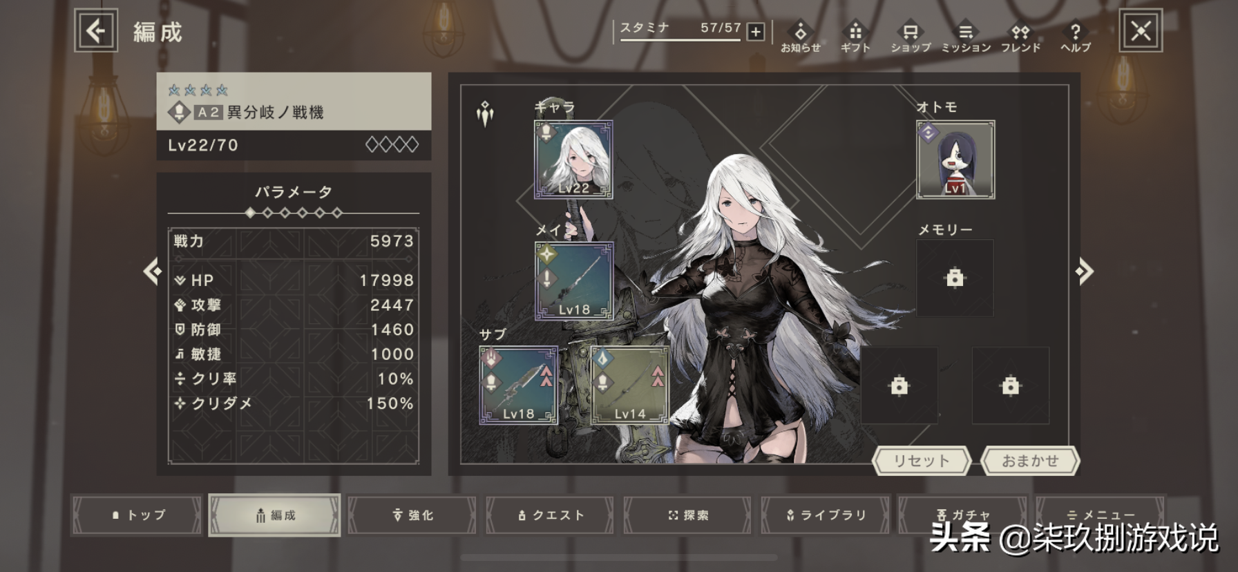或许是为了回应玩家期待,填补新游发售前的“真空期”。又或许是顺应手游市场发展,开拓新的游戏渠道。Square Enix 于 2021 年 2 月 18 日推出了《尼尔》系列的回合制 RPG 手游《NieR Re[in]carnation》(后简称《尼尔:Re》),一经发售就夺得了 ios 销量榜榜首。作为《尼尔:机械纪元》的忠实玩家,没有理由不去尝试一下这款最新的《尼尔》系列作品。不过,此作尚不支持中文,如果没有日语基础,游戏体验会大打折扣。因此,在中文版尚未发售之前,不如先让笔者带大家一睹为快。